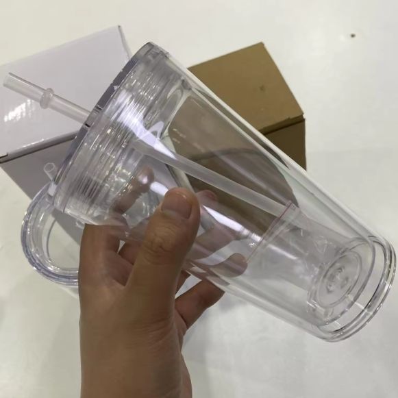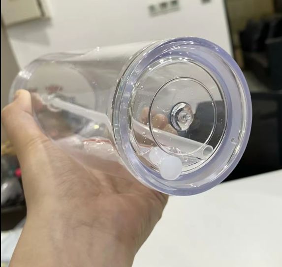 Transparent Acrylic Double Wall Tumbler Snow Globe Plastic Cup with Pre-drilled Hole and Plug and Straw