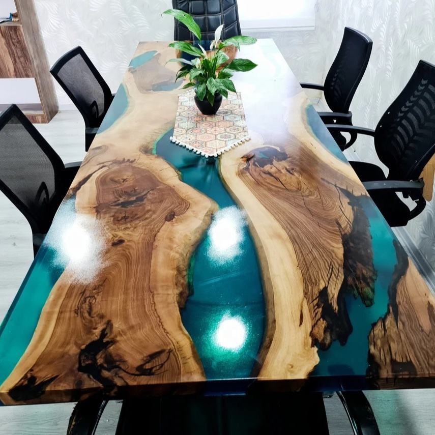 Solid Acacia Wood and Sky Blue Epoxy Resin River Dining Table | Live Edge Handmade Luxury Wooden Furniture for Home and Office