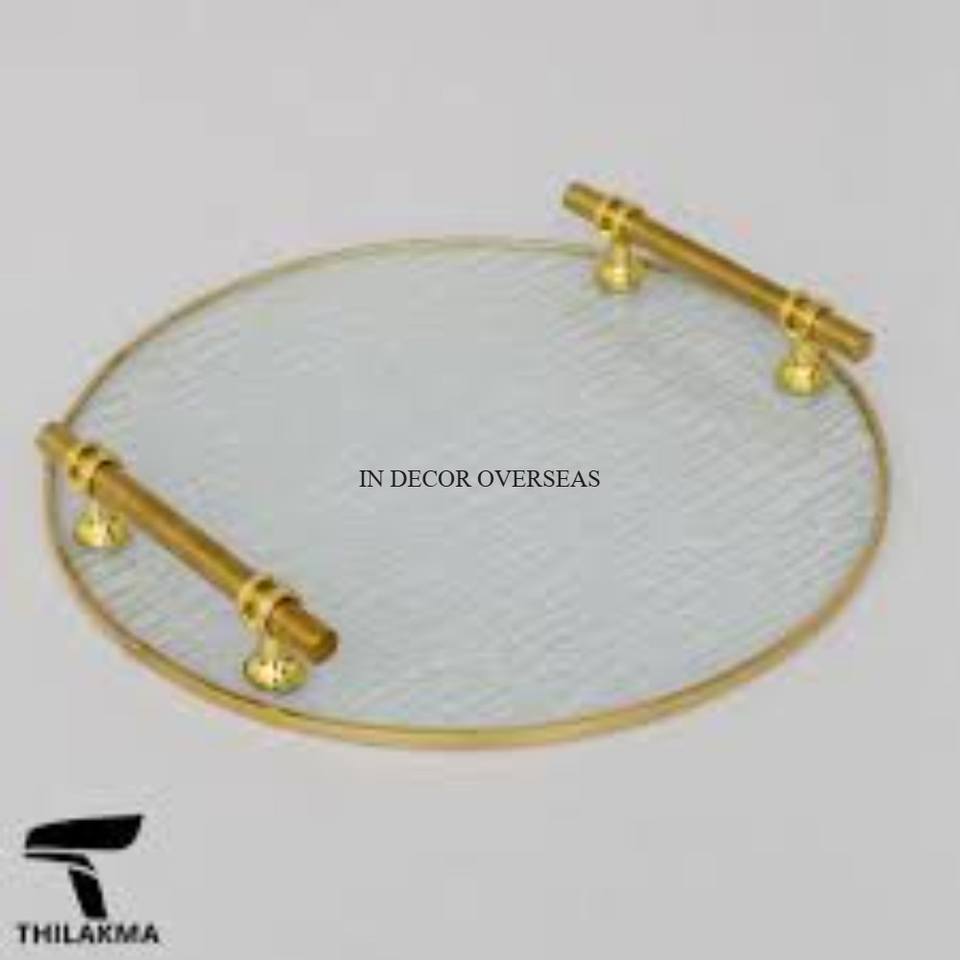 Transparent Unique Texture Clear Glass And Gold Plated Metal Frame And Handles Round Shape Serving Tray From Indian Manufacturer
