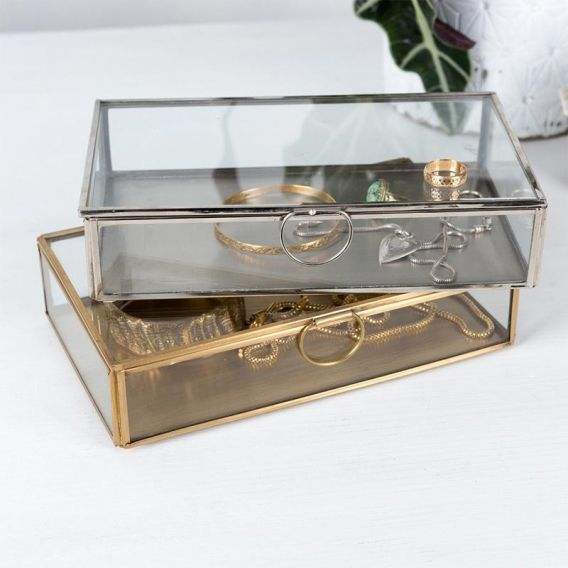 Transparent Glass Panels with Brass Accents Make This Jewelry Box Rectangle Shape for Displaying Collections in a Classy Way