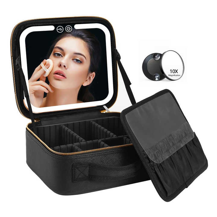 Travel Makeup Organizer Case with LED Light Rechargeable 3 Color Setting Cosmetic Mirror Zipper Closure Fashion Style