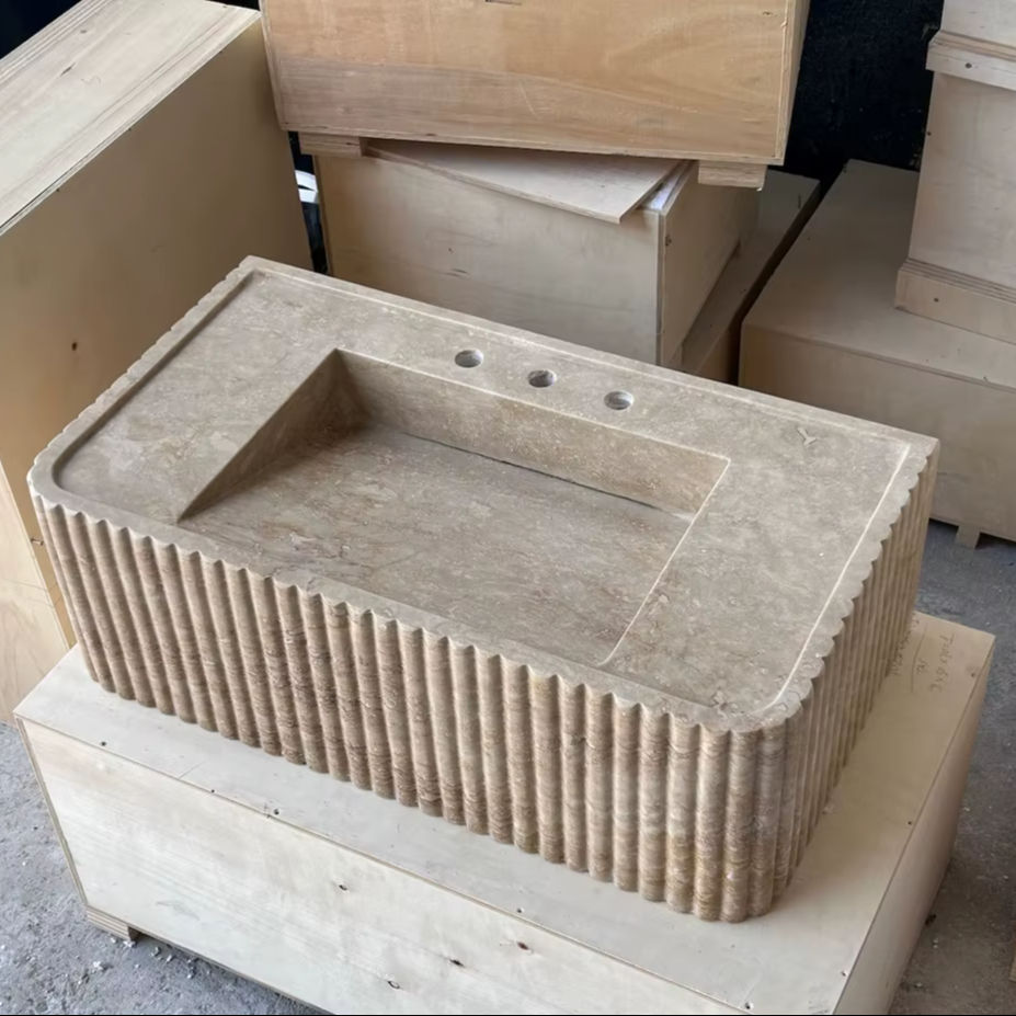 Travertine Marble Rectangular Sink Handmade Natural Stone Wash Basin Integrated Bathroom Countertop Basin Beige Stone Sink
