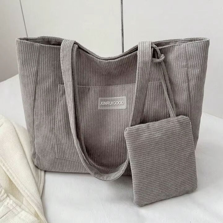 Trending Grey Ribbed Corduroy Tote Bag With Matching Pouch For Women Large Capacity Cotton Fabric Shoulder Handbag Shopping