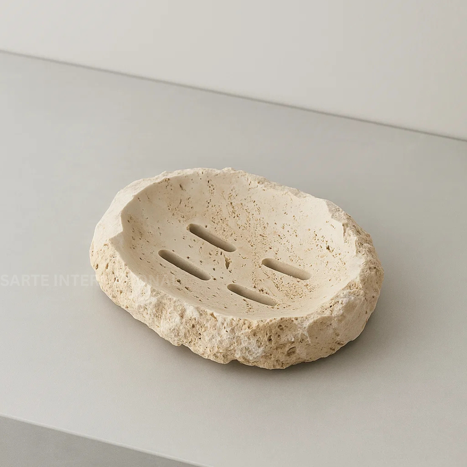 waterproof, Eco-Friendly, self drain, 100% Natural Travertine Stone, Handmade Polished Smooth Surface, Oval with Drainage Slot Design, Beige / Cream Natural Stone Tone, Modern Minimalist Luxury Bathroom Accessory, Long-Lasting and Scratch Resistant, ustainable and Natural Material, Prevents Soap from Melting Quickly, Unique Handmade Stone Craftsmanship, Suitable for Soaps, Sponges, Small Accessories, Stays Stable on Countertop, Easy to Clean and Washable, Bathroom, Washbasin, Kitchen, Spa, Hotels, Resorts, Premium Hotel and Villa Bathroom Decor, Available in Sizes, Shapes, and Colors, Solid Heavy Stone for Stable Placement, Each Piece Has Natural Stone Veins and Texture, Withstands Warm and Moist Conditions, Non-Toxic, Natural, Eco-Conscious, Ideal for Daily Use, Gifting, and Luxury Bathroom, Luxury modern bathroom accessory, Eco-friendly and highly durable, Smart drainage slot design, Multi-purpose daily use