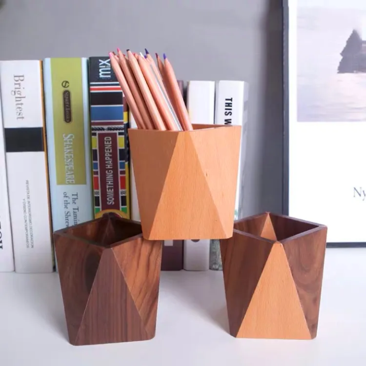 Trending High Quality Office Desk Organizers Custom Creative Walnut Wood Brush Pot Stationery Storage Wooden Pen Holder 2025