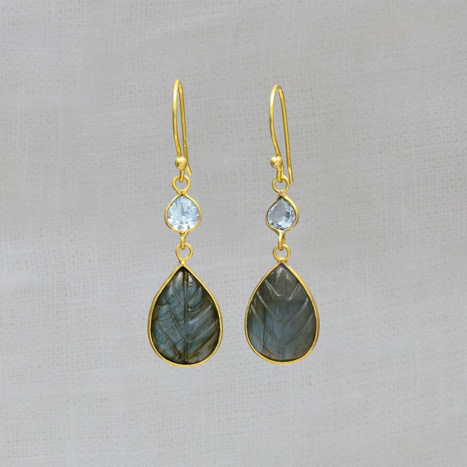 Trending Labradorite and Blue Topaz Carved Gemstone Sterling Silver 925 Solid Gemstone Dangle Earrings Silver Gift for Women