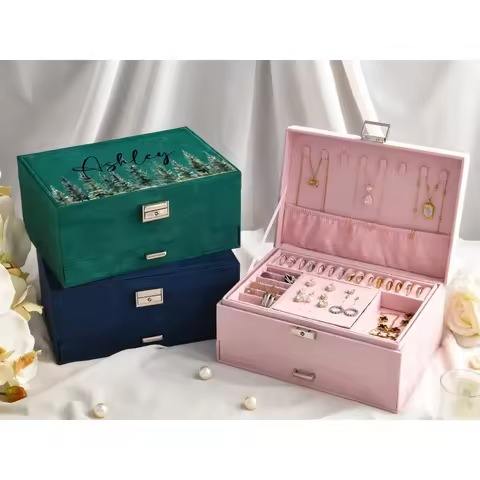 Trending Modern Luxury Square Velvet Jewellery Box with Flower Large Organizer & Drawer Portable Display Box