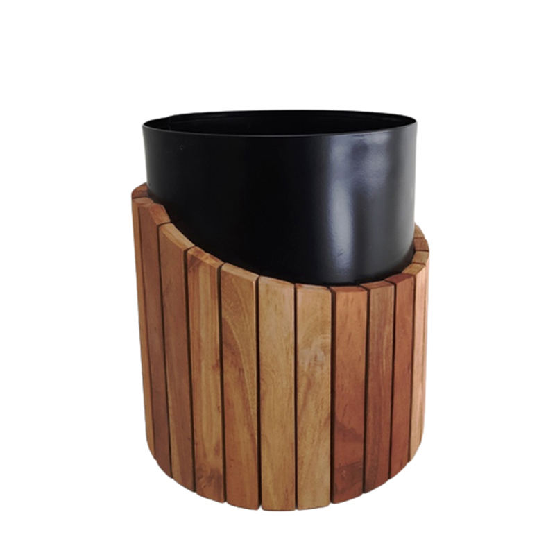 Trending Product Iron & Wood Round Planter Matt Black With Natural Colour Standard Size For Desktop Pot and Flower Pot