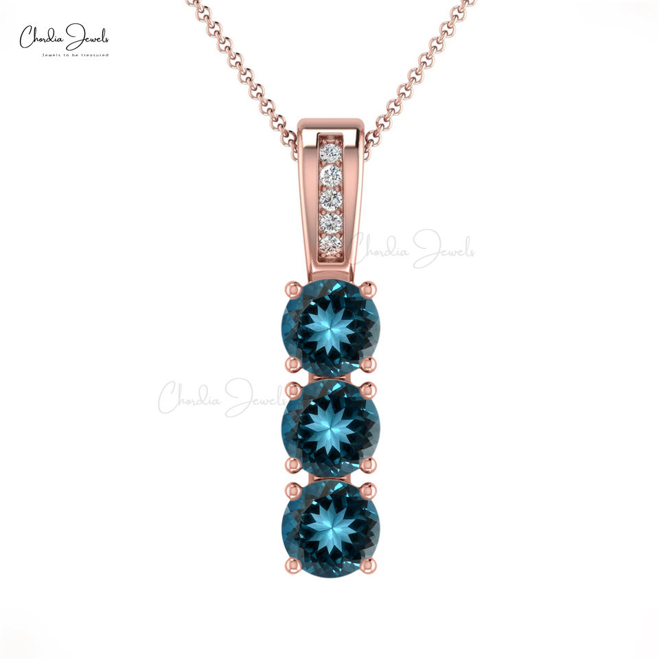 Trending Products 4mm Round Cut London Blue Topaz & Diamond Accent Trilogy Pendant With 14K Solid Gold Wedding Jewelry Bulk Lots