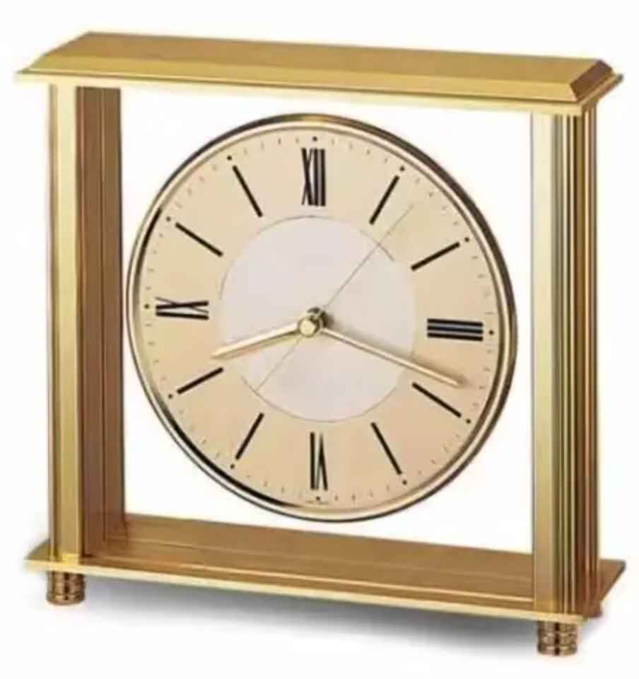 Trending Rectangular Gold Frame Table Clock Circular Face Roman Numerals Polished Metallic Finish Elegant Classic Stylish