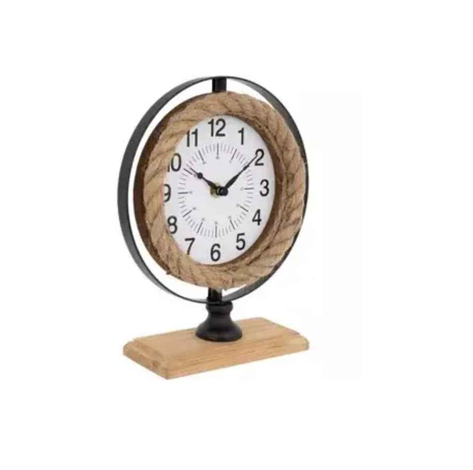 Trending Rustic Rope Border Table Clock White Face Black Numerals Black Metal Frame Wooden Base Nautical Industrial Stylish