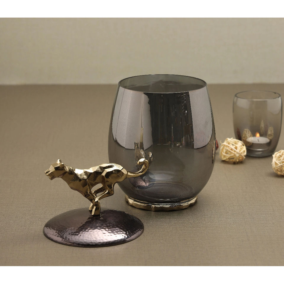 Trending Smoke Glass Storage Jar with Sculpted Aluminum Gold Cheetah Lid Elegant Decorative Accent Container New Design Food Urn