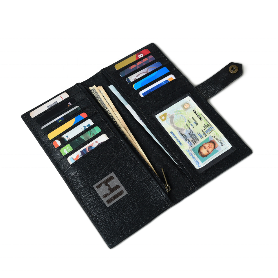 Card slots, Window slots, Cash slots, Internal zipper pocket