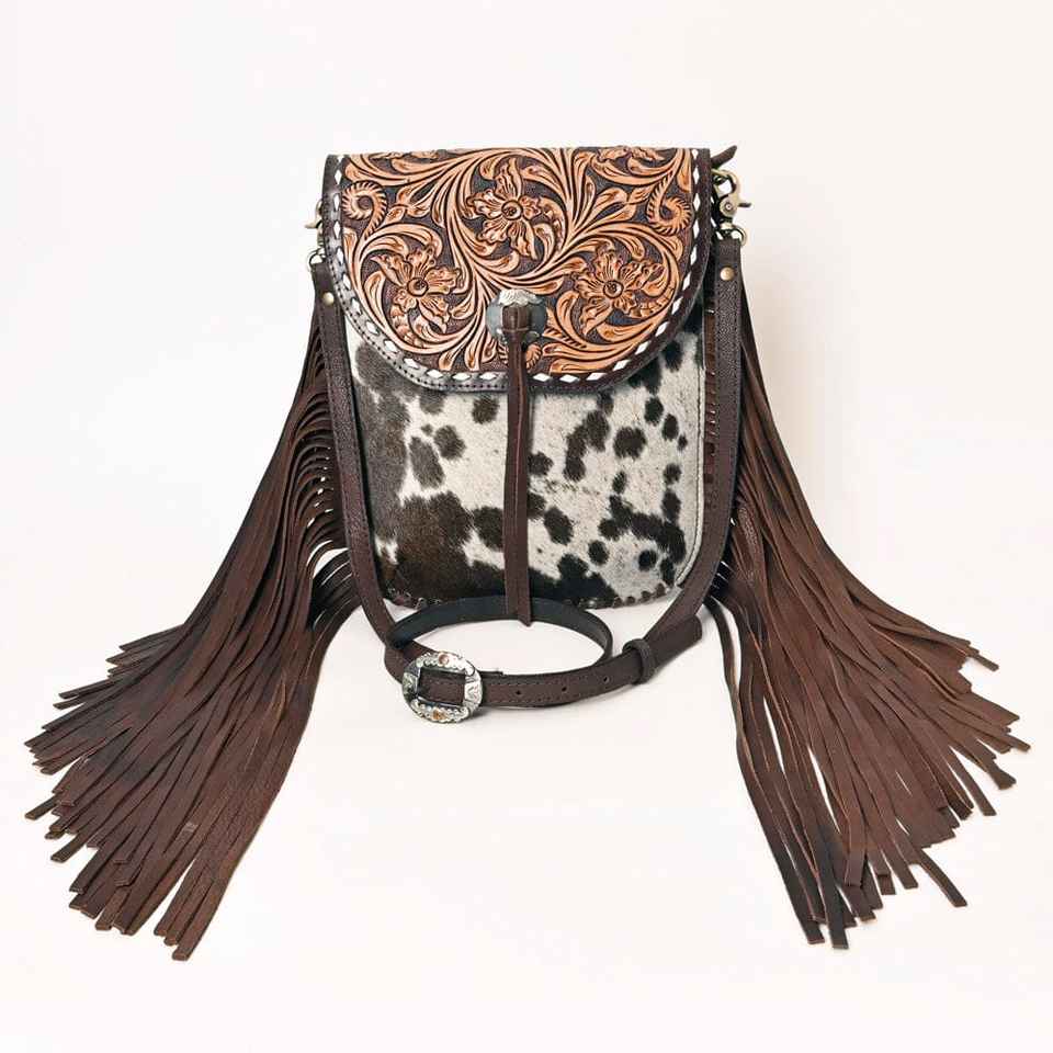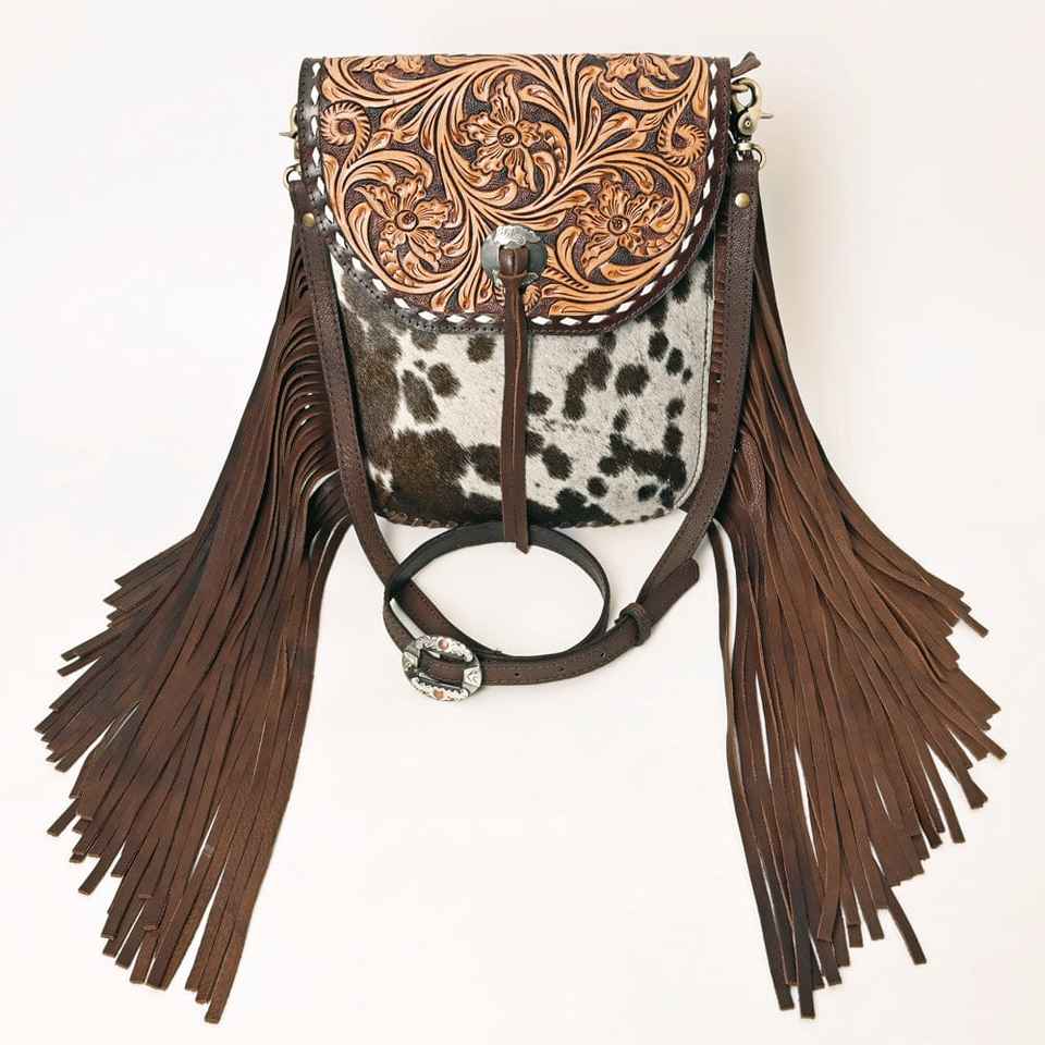Trending Western Bohemian Style Genuine Leather Sling Tote Bag with Zipper Closure Women's Luxury Handmade Hair Flower Design