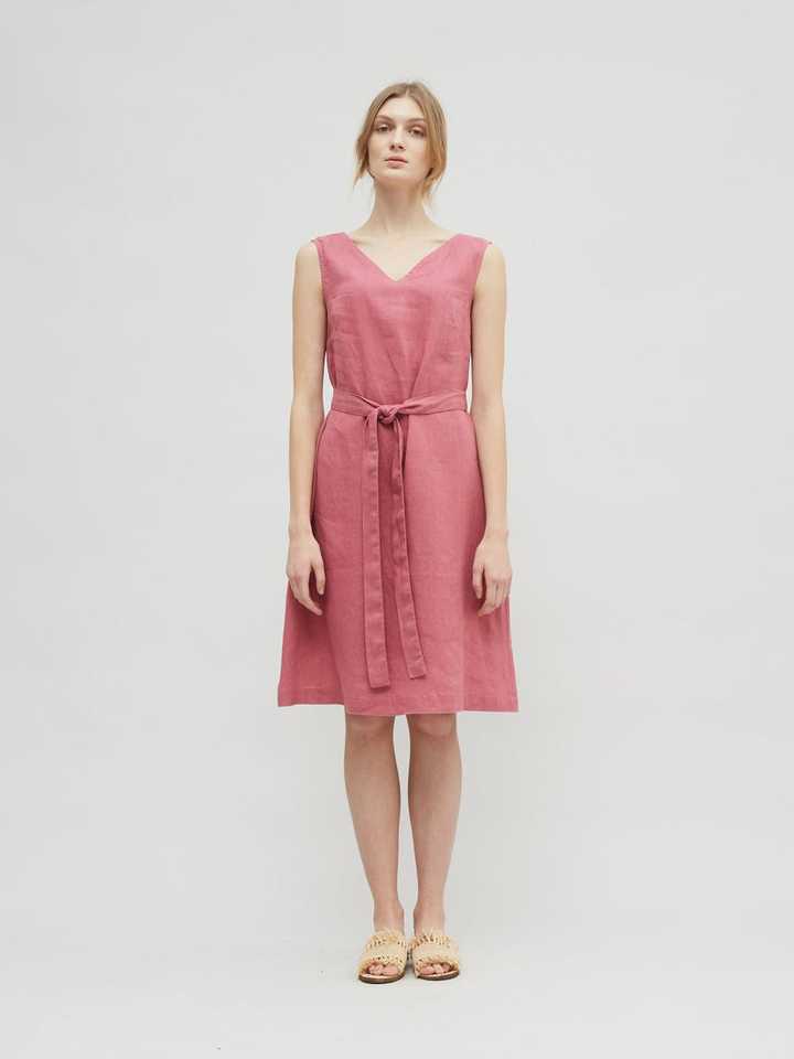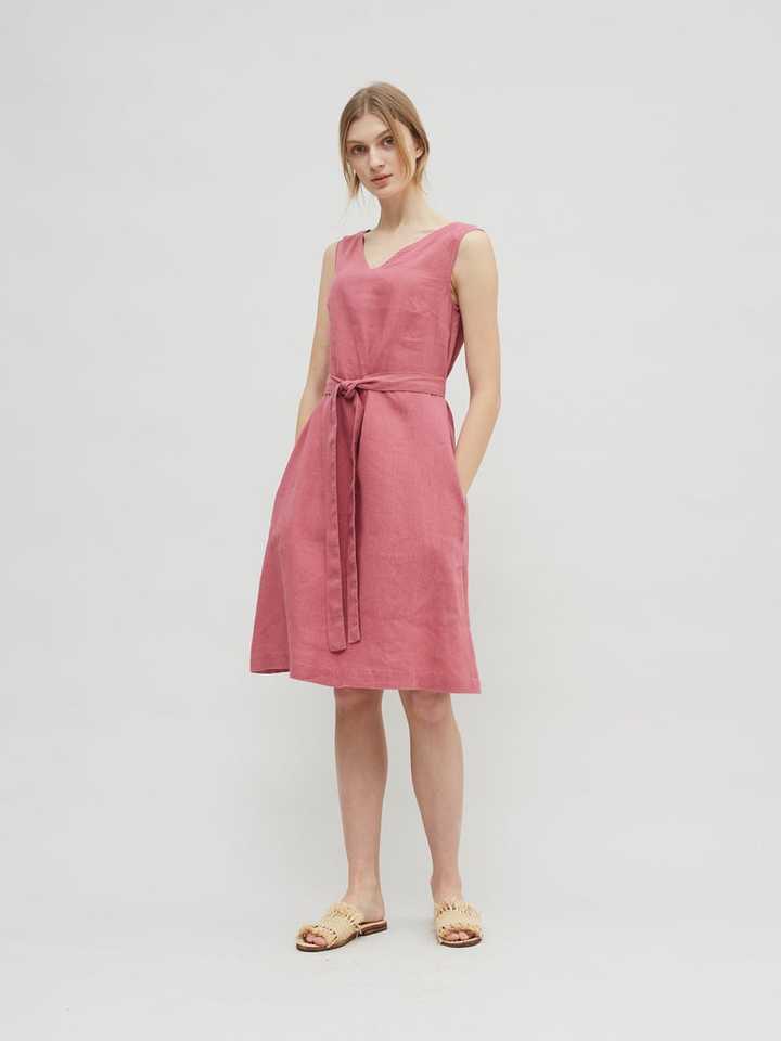 Trending latest design pink color crepe fabric v-neck sleeveless knee-length for girls linen dress