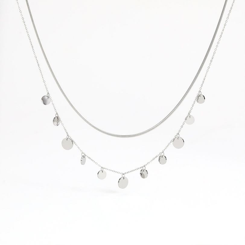 Trendy 18K Gold Plated Stainless Steel Snake Chain Necklace for Women Featuring Pearl Disc Coin Pendant and Layered Design