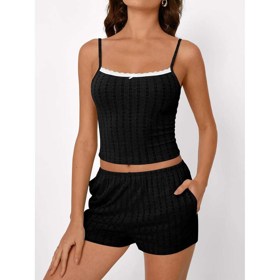 Trendy 2-Piece Queen Women's Summer Outfits Floral Lace Trim Cami Top & Shorts with Logo Black Pajama Sets & Loungewear