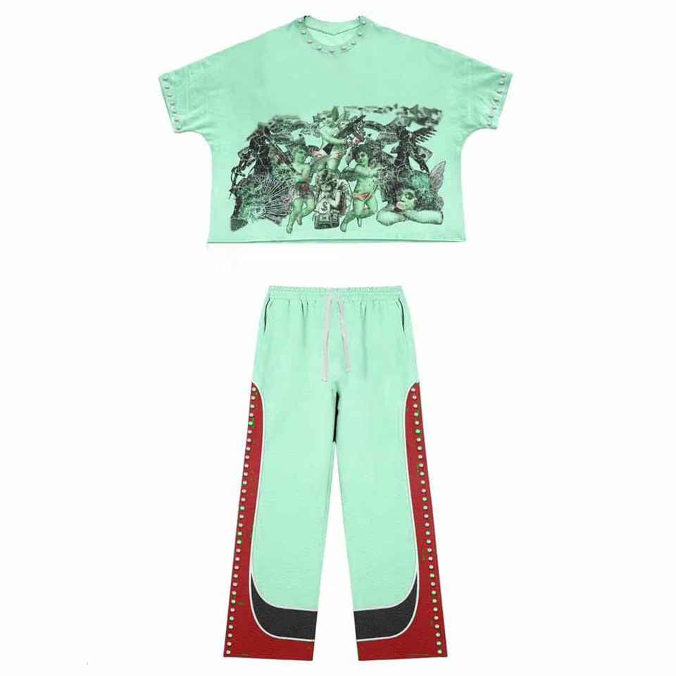 Trendy Cotton Two Piece Tracksuit Outfit Featuring Printed Graphic T-Shirt and Jogger Pants for Streetwear and Fitness Use
