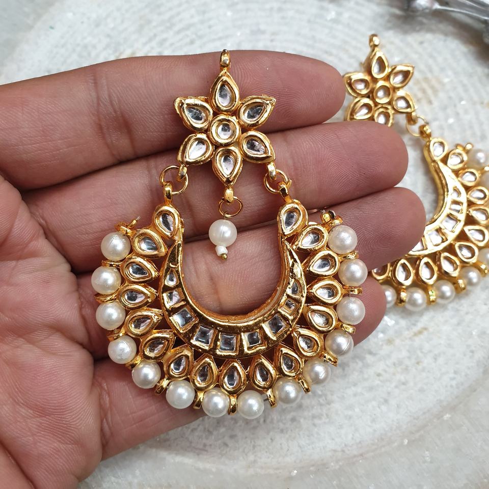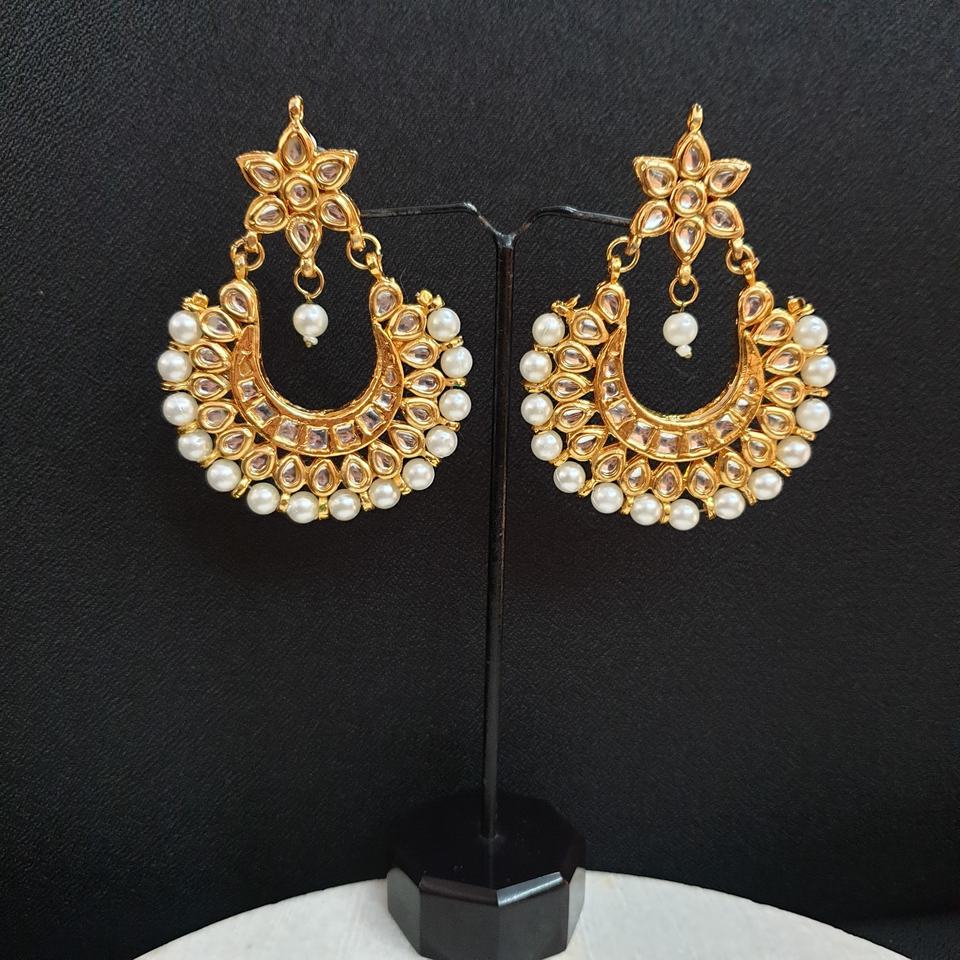 Trendy Cute Kundan Pearl Beaded Chandbali Earrings Bohemia Ethnic Style Gold Plated Brass Diamond Number Shape for Party Wedding