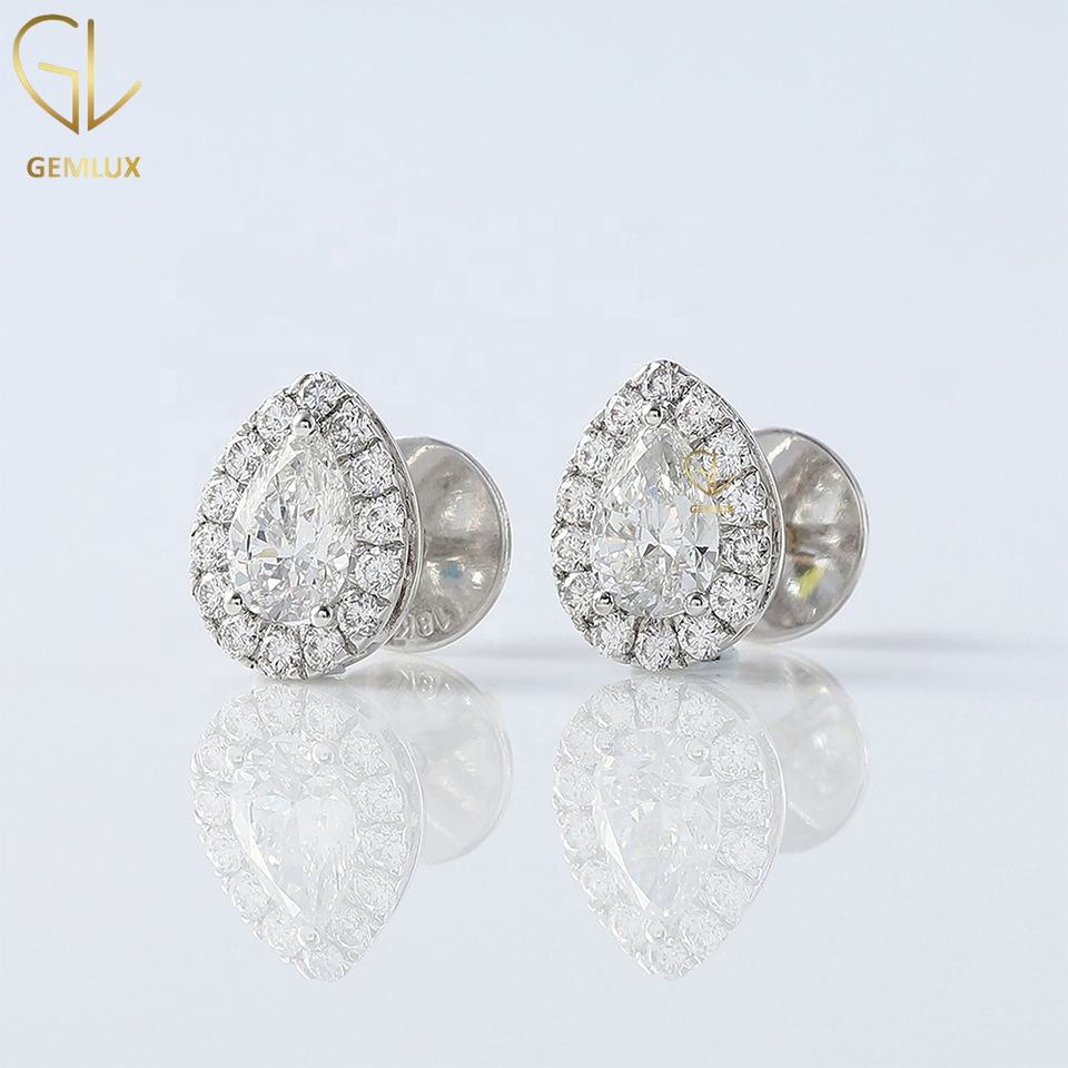 Trendy Design 14k Solid White Gold Pear Cut F Color VS Lab Grown Diamond Halo Minimalist Stud Earrings For Women
