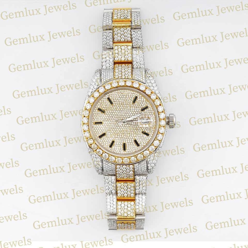 Trendy Design Fully Iced Out D Vvs Moissanite Diamond Two Tone Auto Date Pass Diamond Tester Stainless Steel Diamond Watch