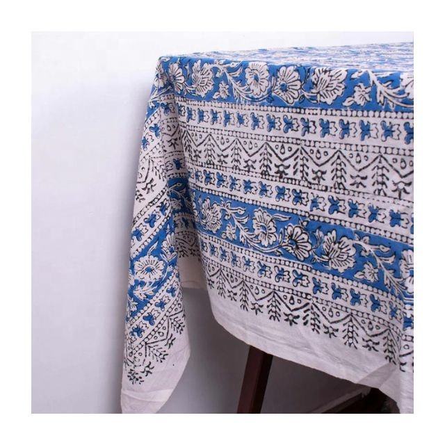 Trendy Design New Arrival 100% Organic Cotton GOTS Certificate High Quality Blue Border Cute Floral Printed Bind Table Cloth Set