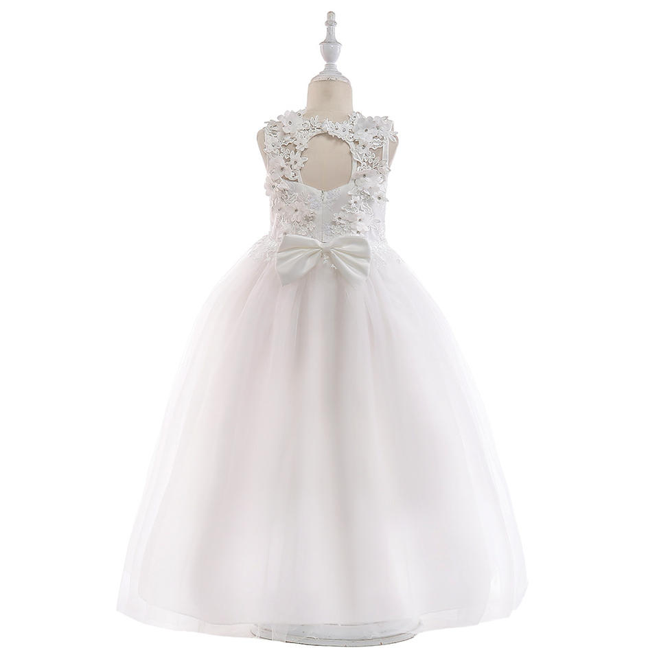 Trendy Elegant Embroidery Floral Neck Crystal in Belt Girls Wedding Gown Dress With Bow