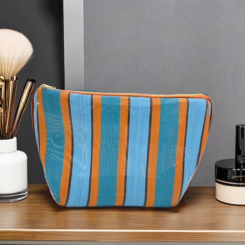 Trendy Fashionable Large Striped Cosmetic Bag for Women Recycled Plastic with Zipper Closure Casual Elegant Customizable Size