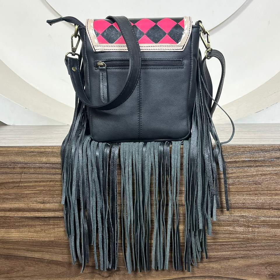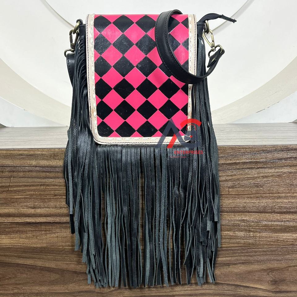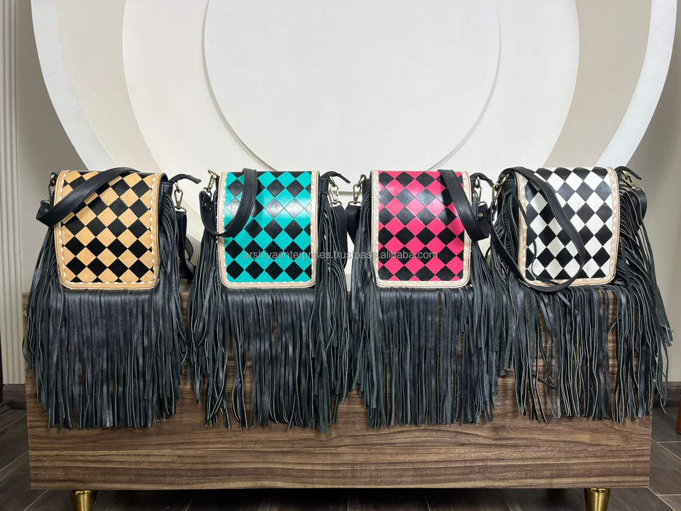 Product name:Hand Tooled Checkered Leather Fringe Crossbody Bag