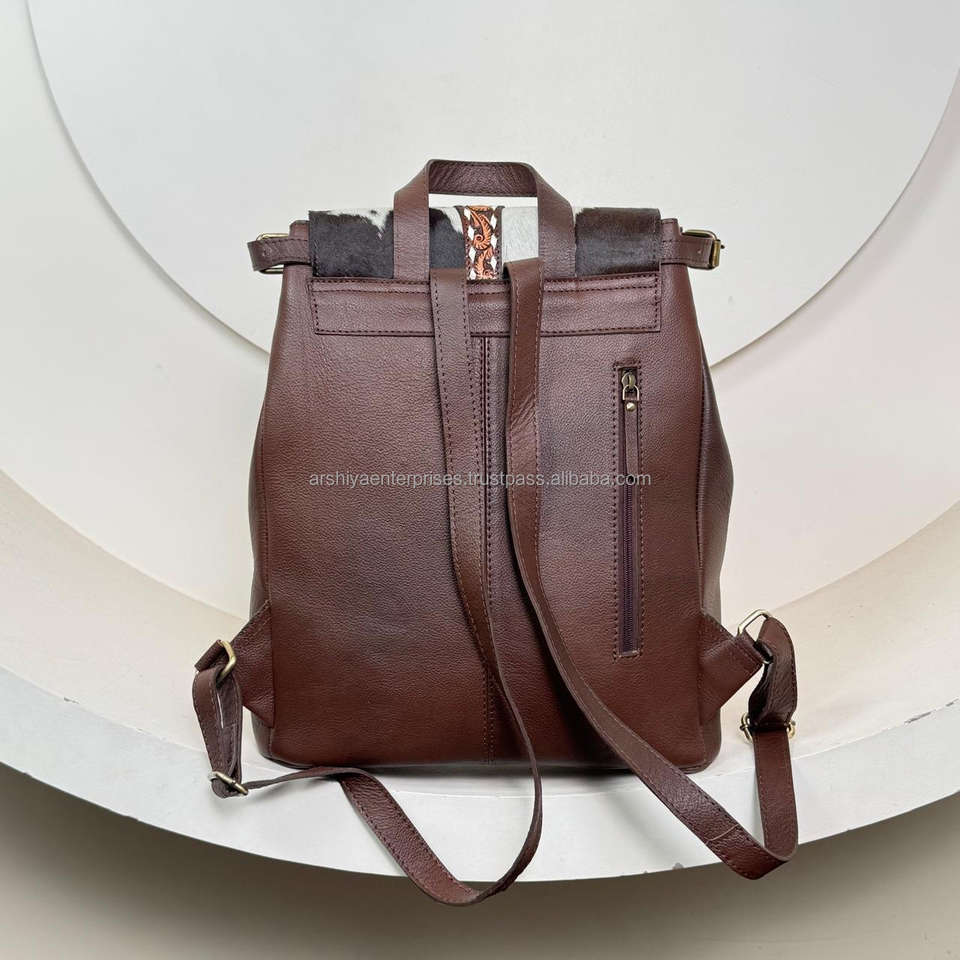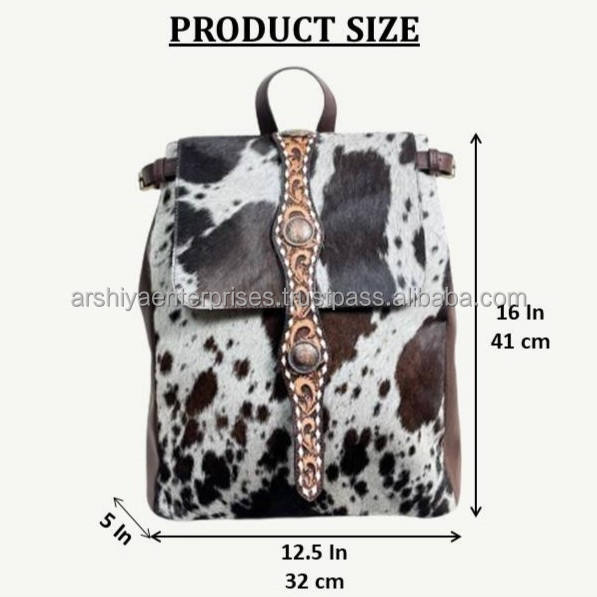 Trendy Hand Tooled Cowhide Leather Backpack Western Style Bag with Tooled Strap and Conchos Unique Genuine Hair On Hide Rucksack