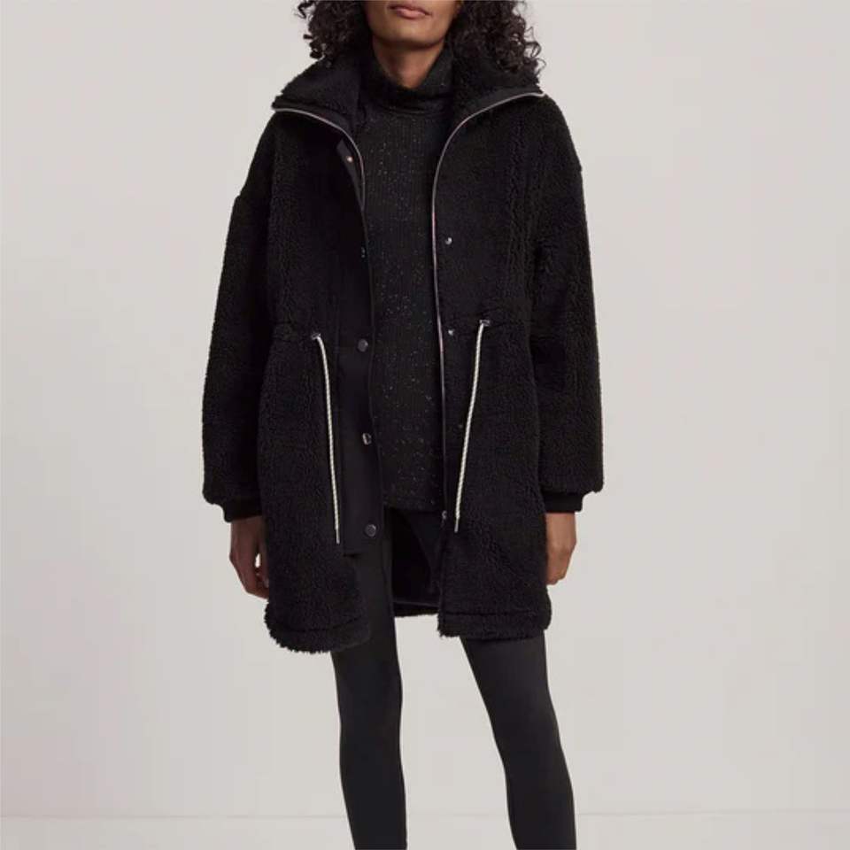 Trendy High-Neck Black Sherpa Jacket with Secure Snap Buttons Soft and Comfortable Winter Jacket