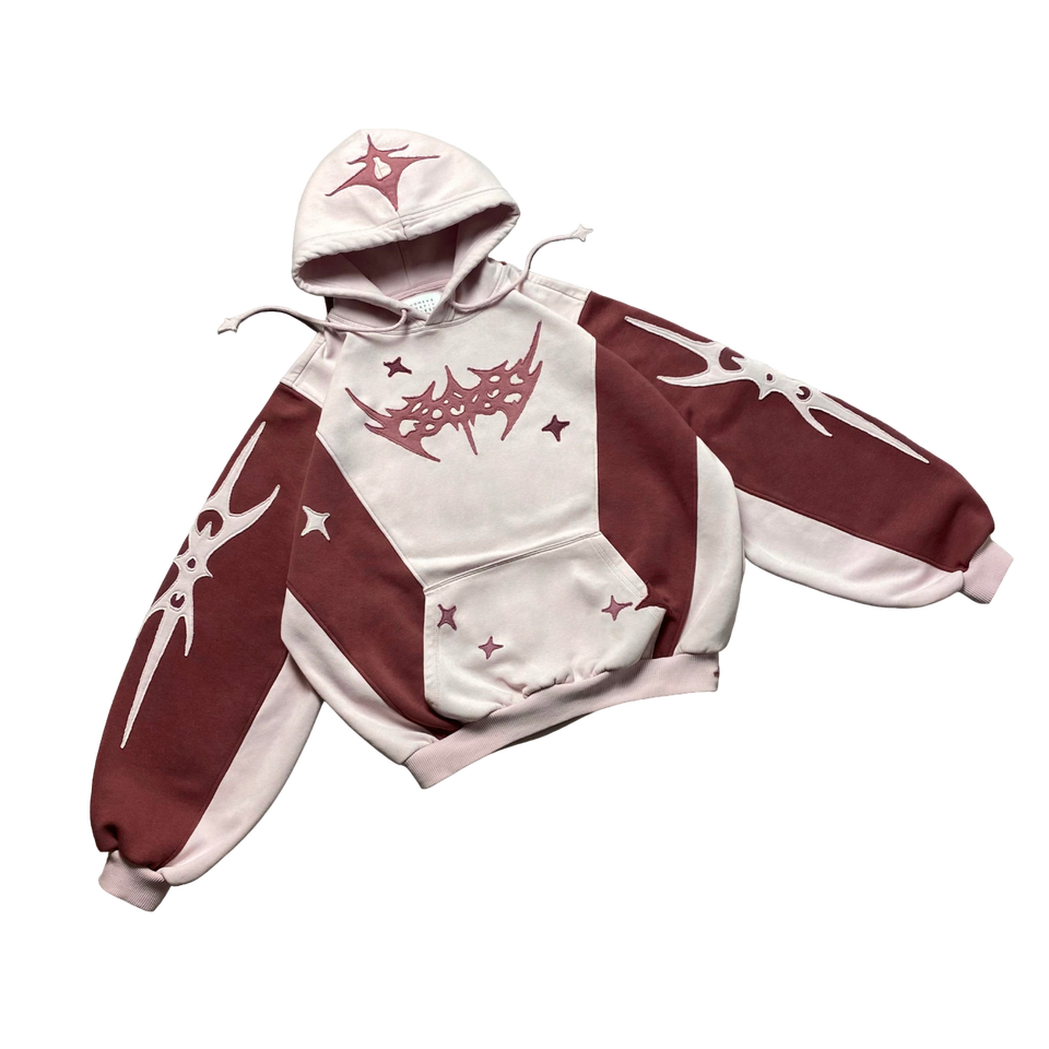 Trendy Maroon Pink Patchwork Hoodie Oversized Gothic Embroidery Pullover Heavyweight Fleece Unisex Streetwear Hoodie