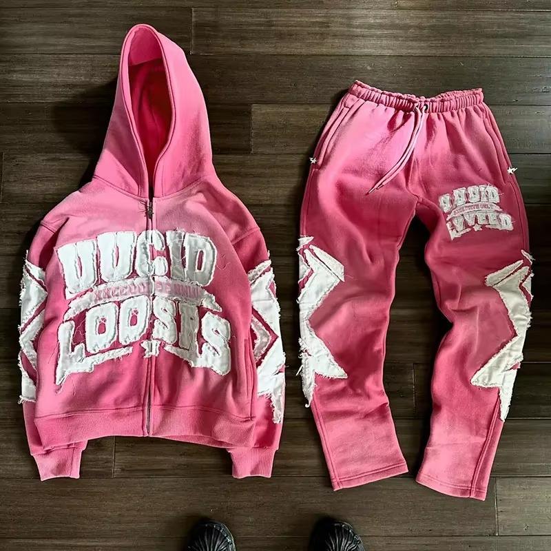 Trendy Men's Custom Zip-Up Sweatsuit Acid Wash Hoodie Flared Sweatpants with Distress Patch Embroidery Casual Flared Tracksuit