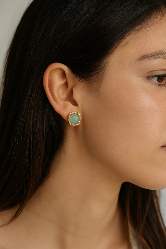 Trendy Natural Amazonite Cushion Shape Collet Stud Earrings for Women Anti-Tarnish Brass Jewelry Great Gift Idea