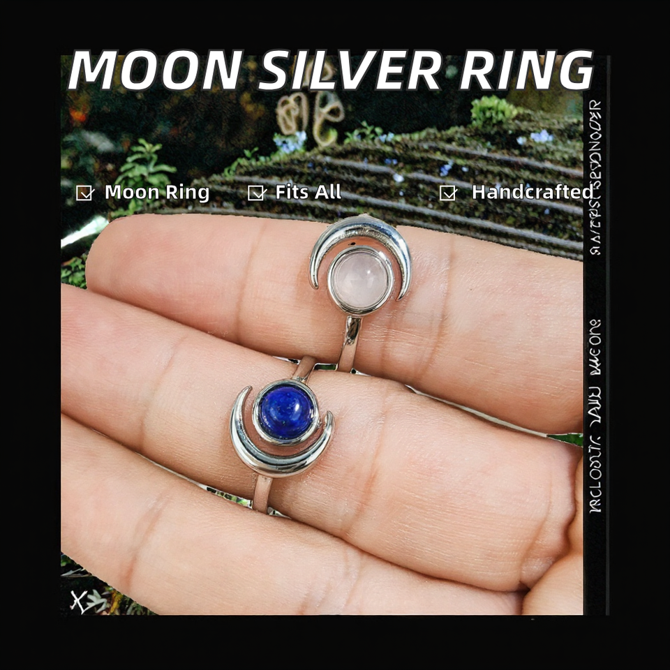 Trendy Natural Lapis and Rose Quartz Moon Shape Adjustable Ring 925 Sterling Silver Jewelry Wedding Anniversary Gift For Women