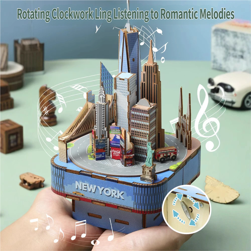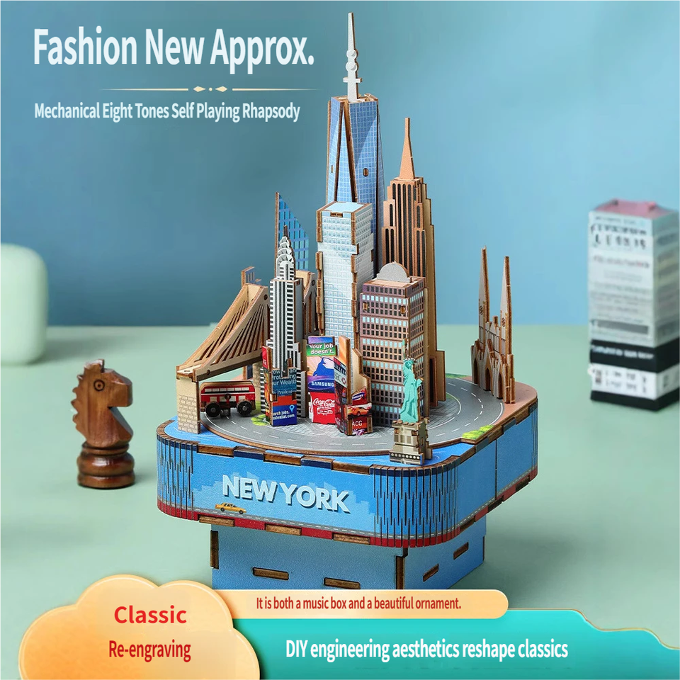 Trendy New York Wooden Music Box 3D Puzzle Challenging Assembly Model Creative Adult Gift Wholesale