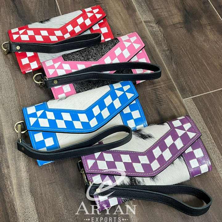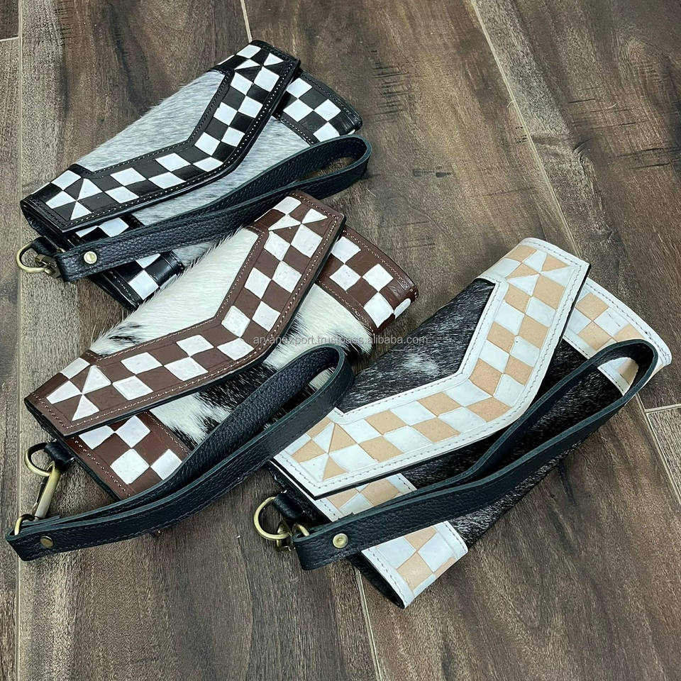 Trendy Pink Checker Tooled Genuine Cowhide Leather Wristlet Clutch Women Western Design Fashion Hair On Hide Phone Wallet Purse