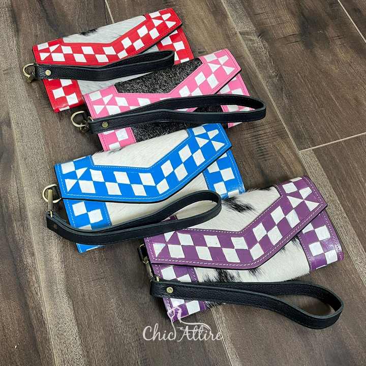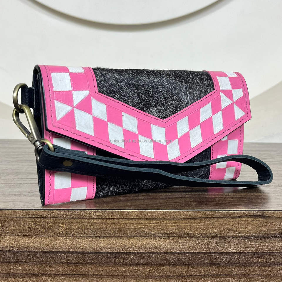 Trendy Pink Checker Tooled Genuine Cowhide Leather Wristlet Clutch Women Western Design Fashion Hair On Hide Phone Wallet Purse
