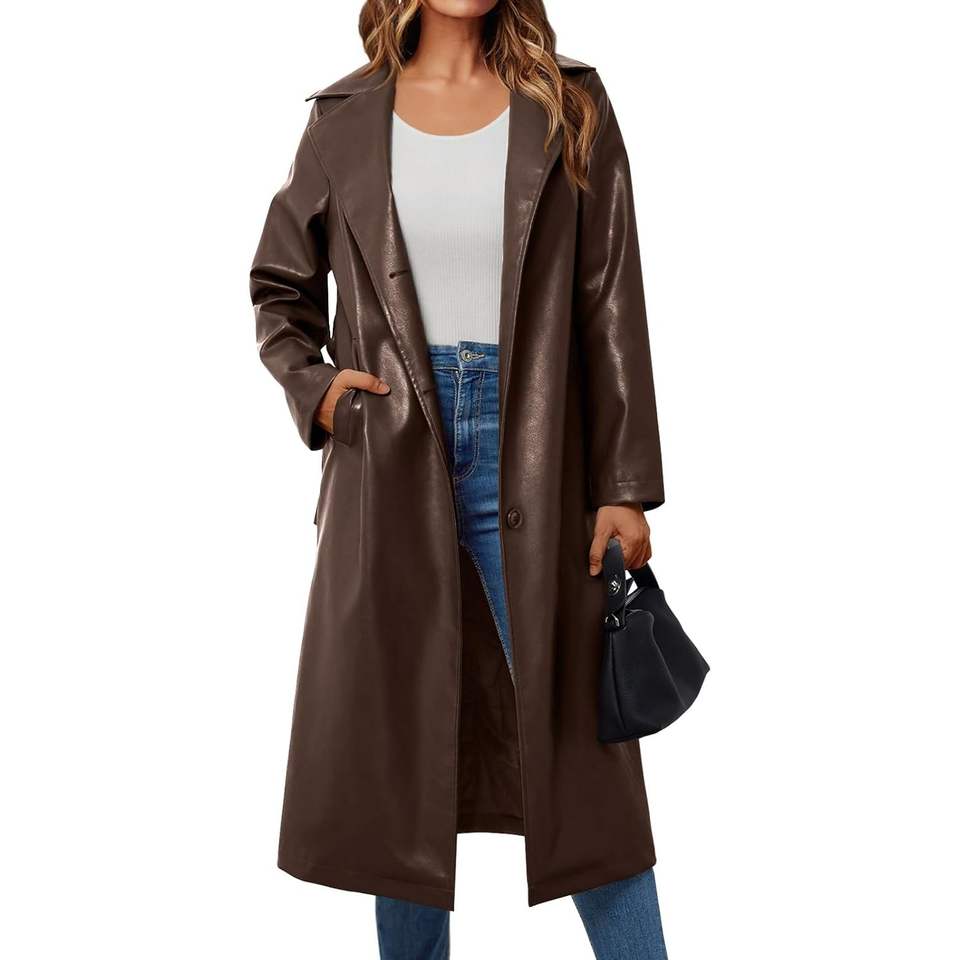 Trendy Queen Womens Long Leather Trench Coat Blazer with Lapel Open Front Faux Fur Lining Print Decoration and Belt