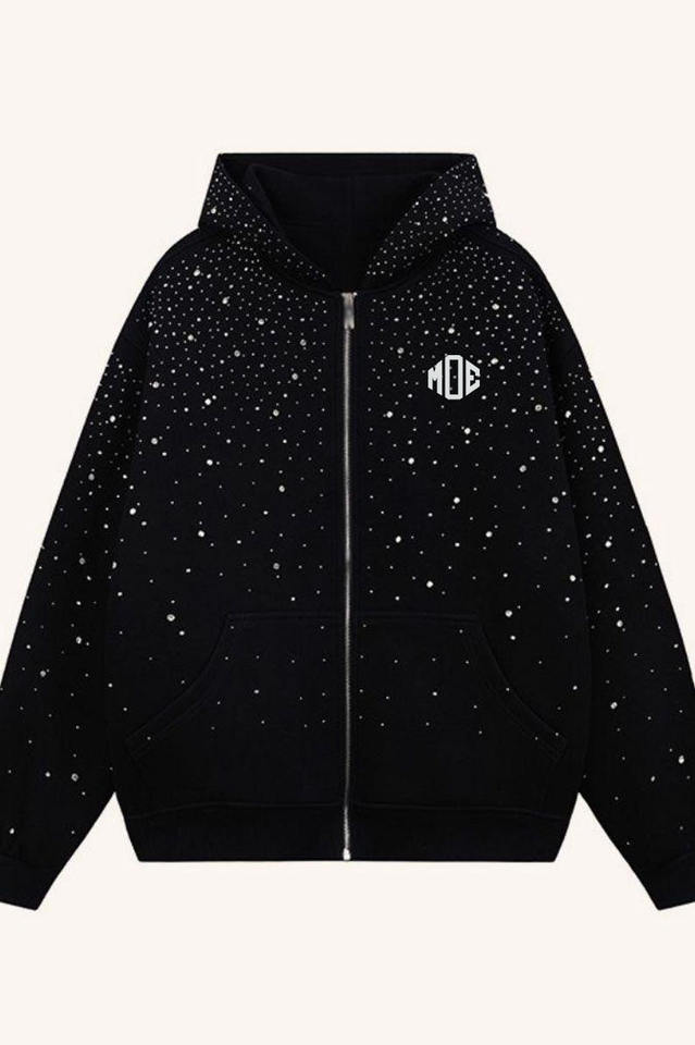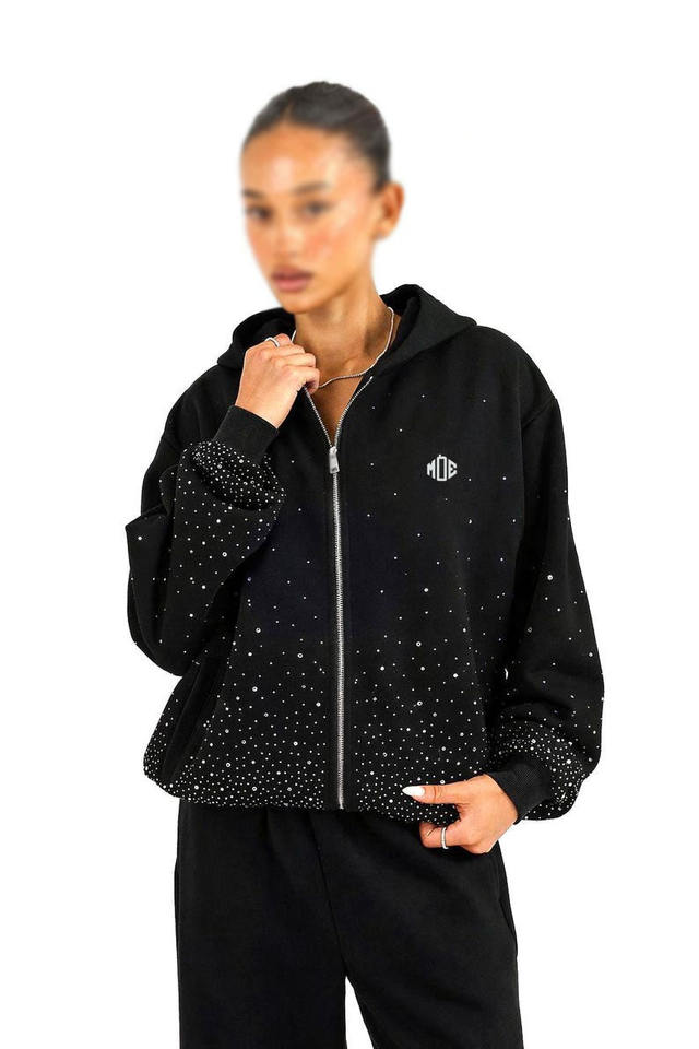Trendy Rhinestone Zip Up Black Women's Hoodies Heavyweight Glitter Detail Streetwear Sparkly Zipper Hoodie Wholesale Supplier