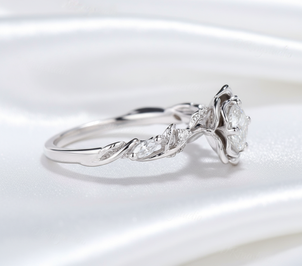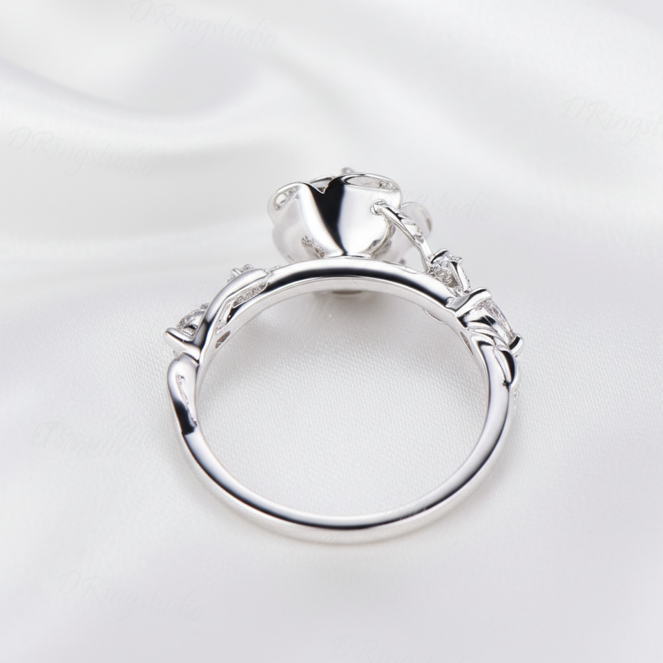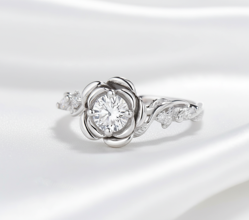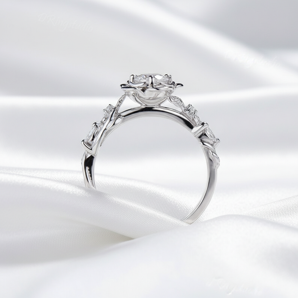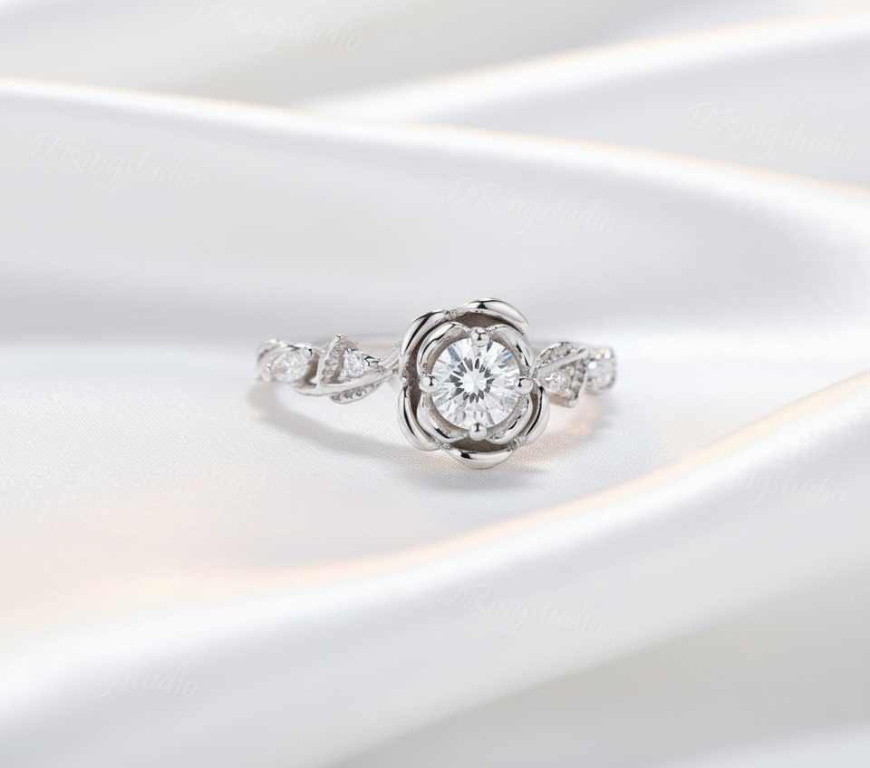 Trendy Rose Flower Shape 0.5CT Round Brilliant Cut VVS Moissanite Engagement Ring Nature Inspired Twig Leaf Blossom Wedding Band
