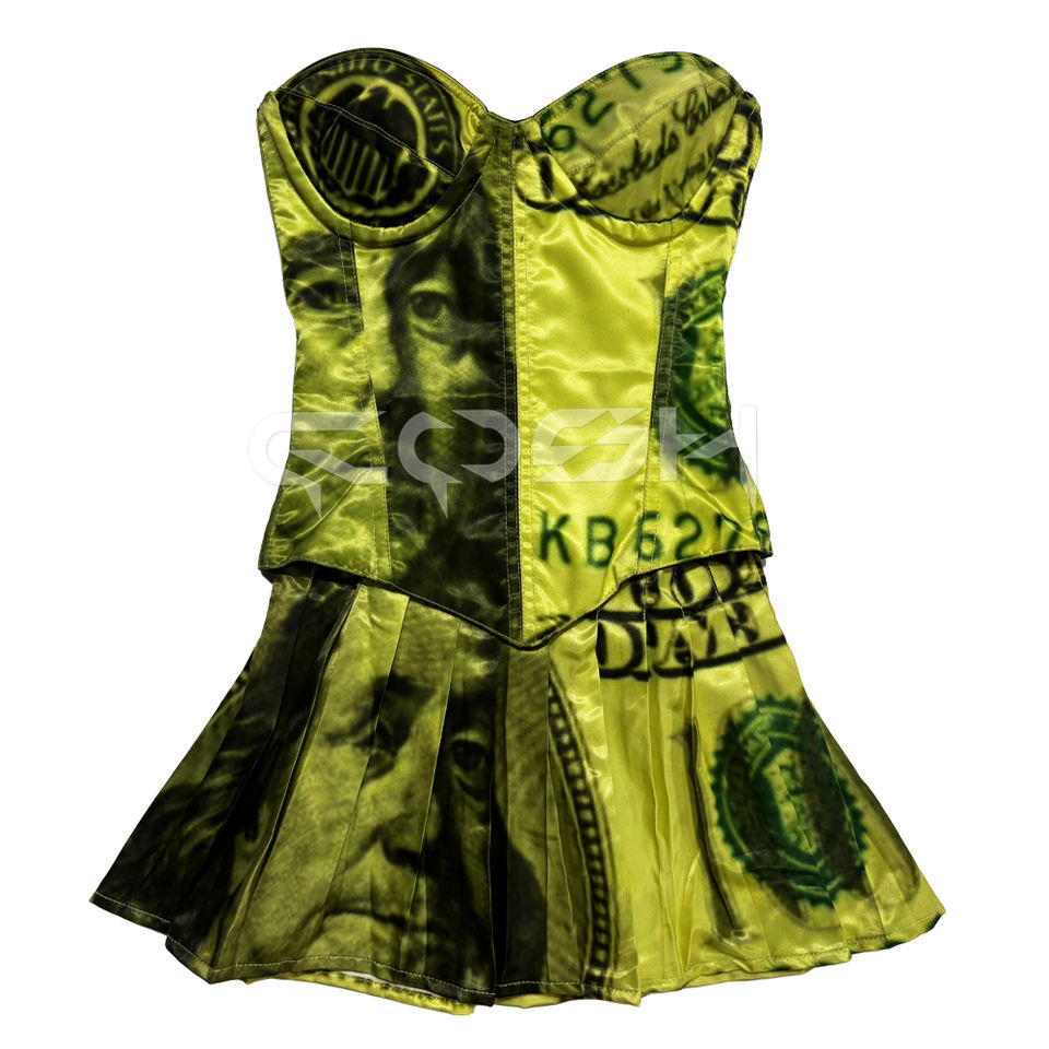 Trendy Satin Fashion Outfit Hourglass Sexy Figure Dollar Print Corset and Skirt Set Supplier