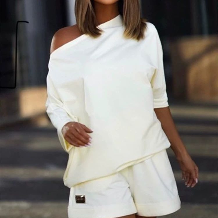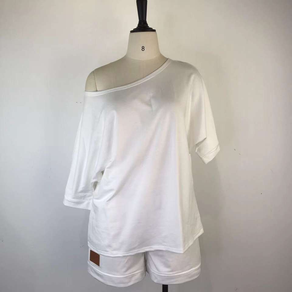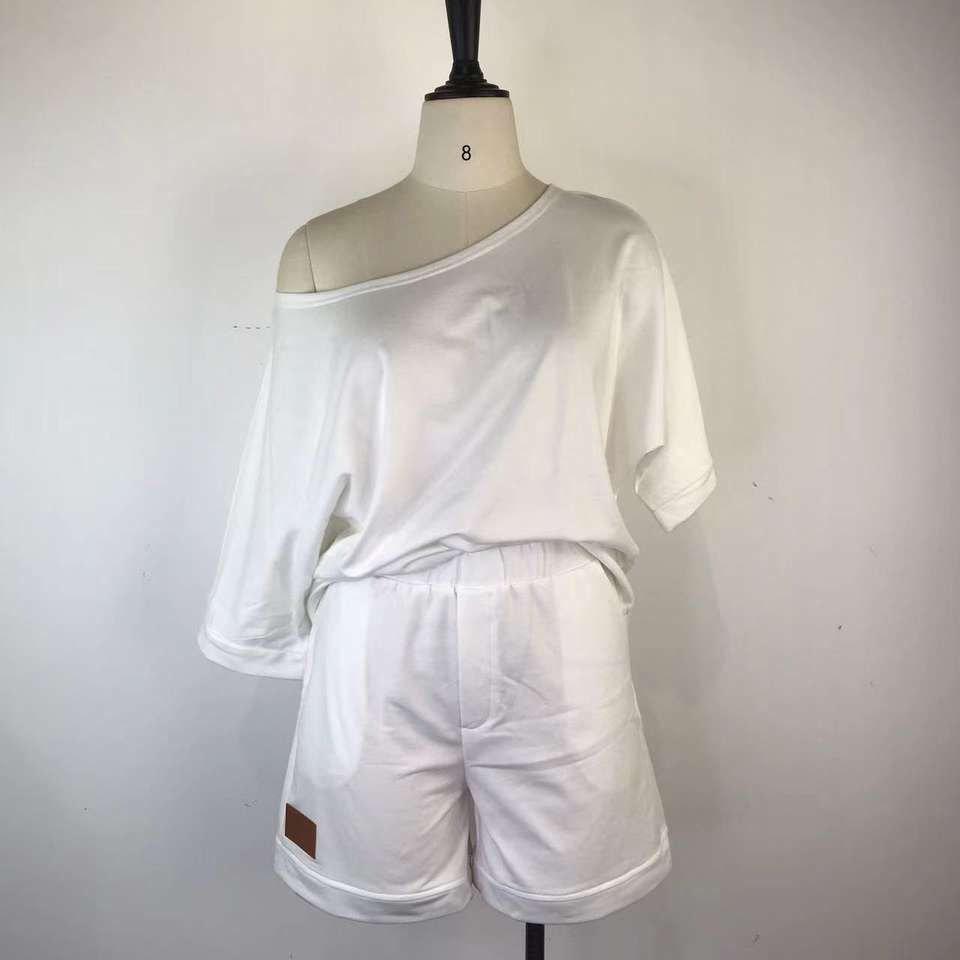 Trendy Solid Color Short Sleeve One Shoulder Loose and Fit Summer Two Piece Women Sets Fashion