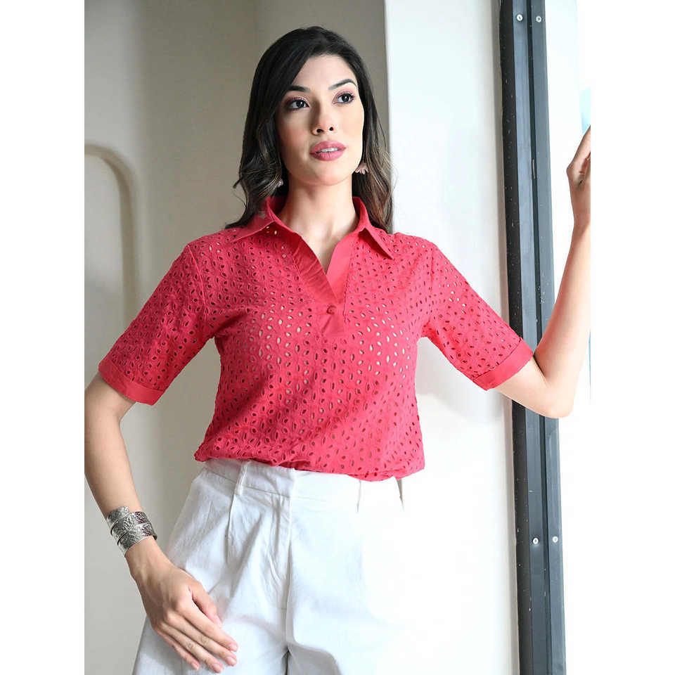 Trendy Vintage Boho Woven Cotton Shirt Pink Schiffli Fabric with Flared Sleeves and Shirt Collar Perfect for Casual Summer Days