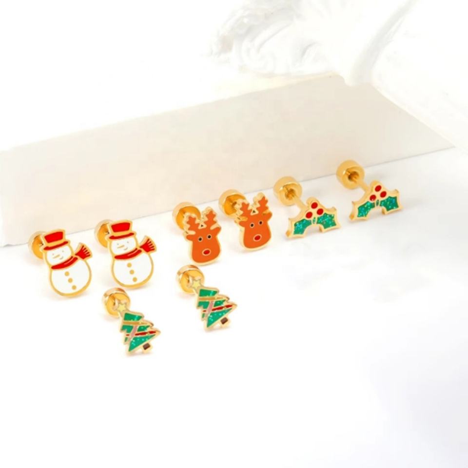 Trendy Wholesale Bulk Customize Earrings Jewelry Women Stainless Steel 18K Gold Plated Cute Snowman Elk Christmas Stud Earrings