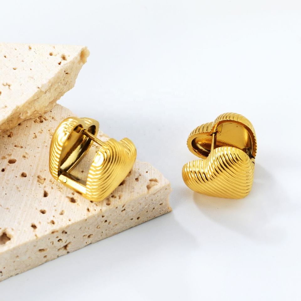 Trendy Women's Stainless Steel Jewelry Hoop Earrings with Striped Texture and Double Heart Waterproof 18K Gold Plated Earrings