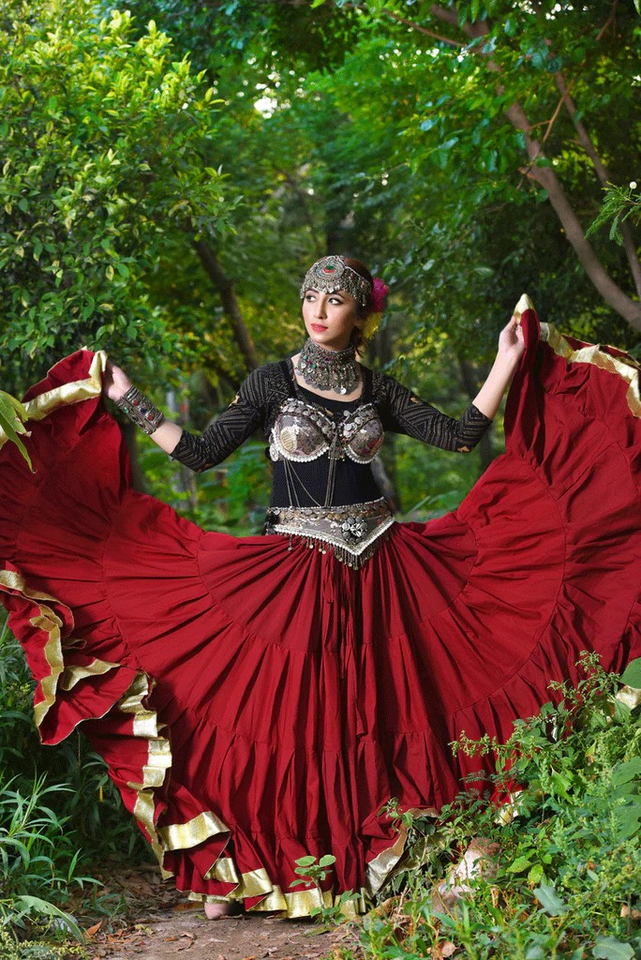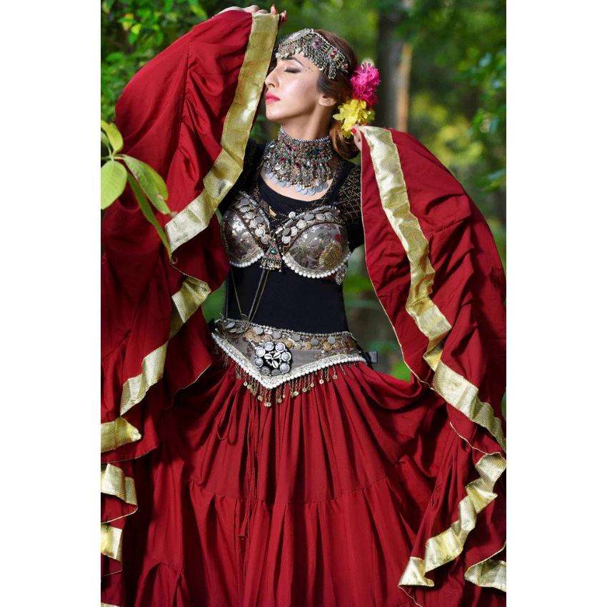Tribal Fusion Belly Dance Costume Maroon Gypsy Flared Skirt Mirror Work Choli Antique Coin Belt Set