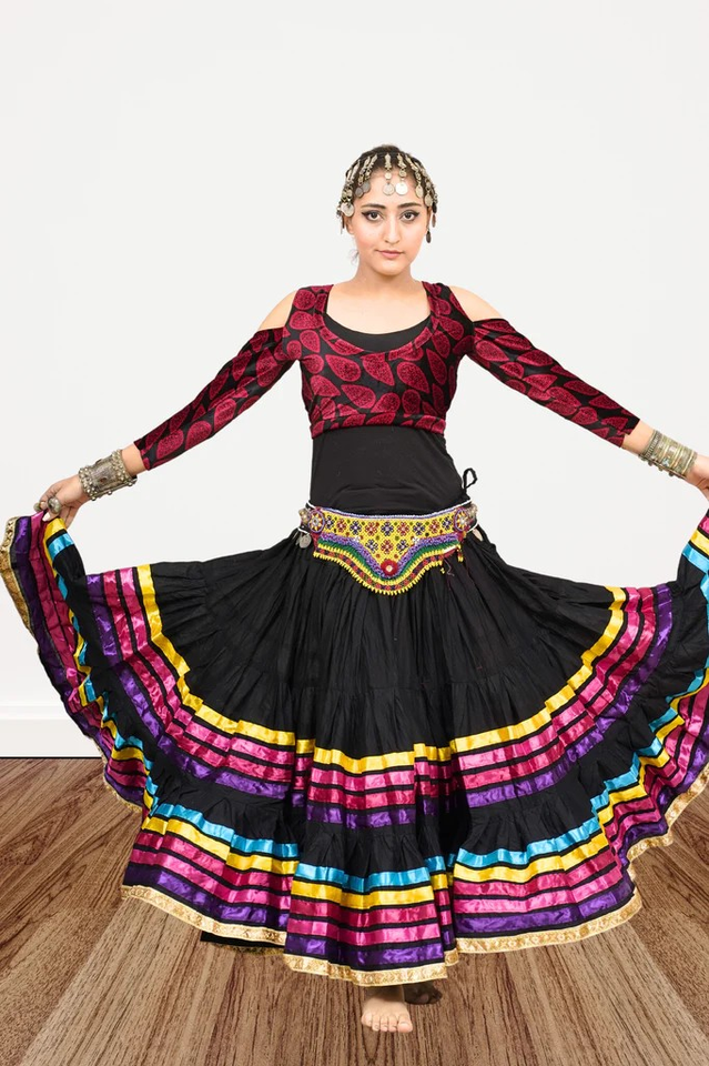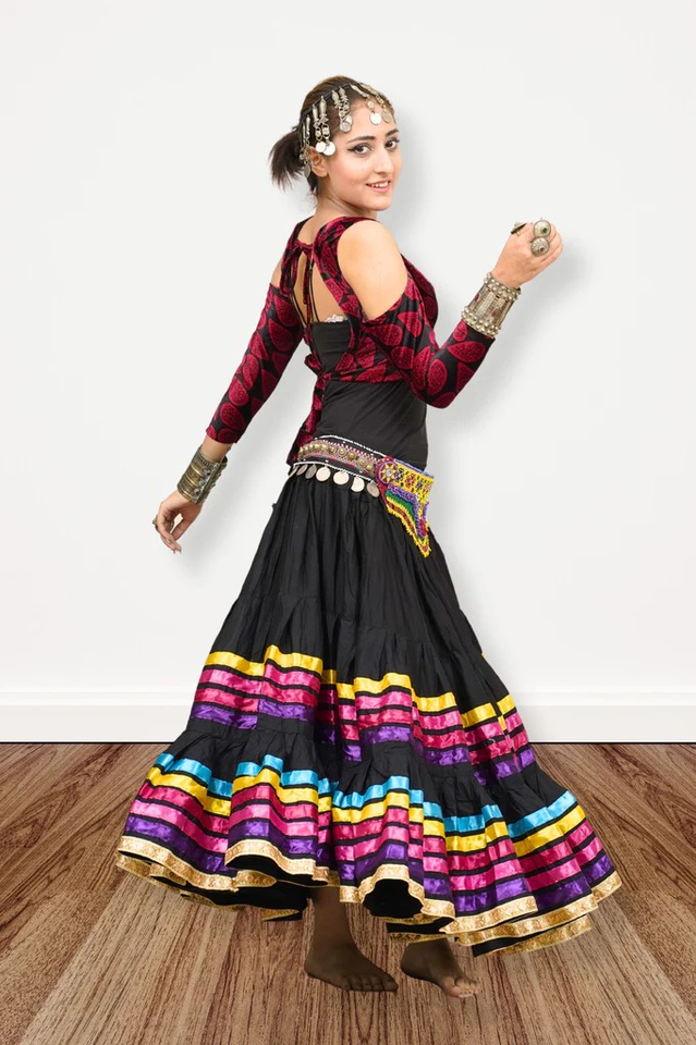 Tribal Gypsy Belly Dance Costume Multicolor Border Flared Skirt Embroidered Belt Performance Top for Women