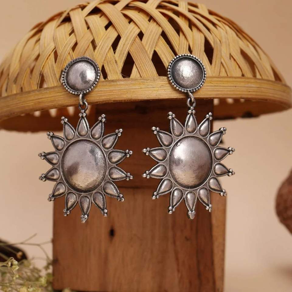 Tribal Oxidized Silver Sunburst Dangler Earrings Antique Ethnic Jewelry For Women