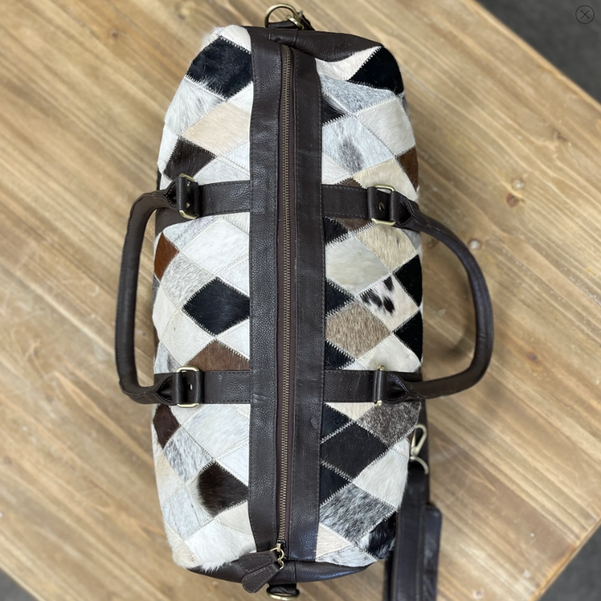 Luxury Style Tricolour Black White Cowhide Duffle Bag Genuine Leather Wheels for Travel Sports Gym Overnight Weekender Use